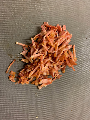 Por otro lado cogemos el bacon y hacemos pequeñas tiras para añadir a la salsa de la carne cuando vayamos a servir.